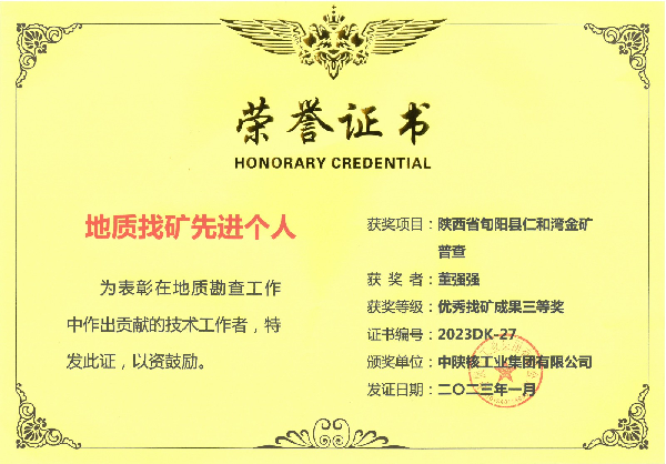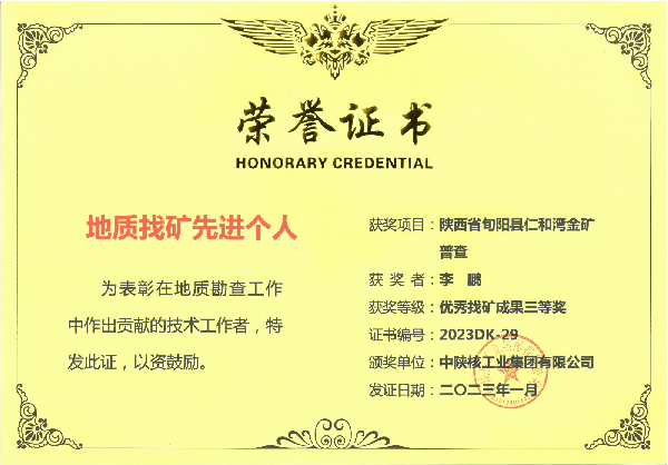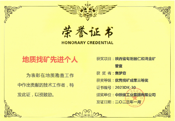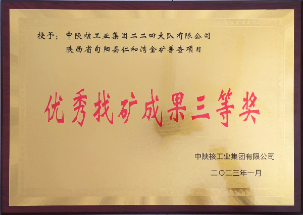中陜核工業(yè)集團有限公司2022年度優(yōu)秀找礦成果三等獎 陜西省旬陽縣仁河灣金礦普查項目