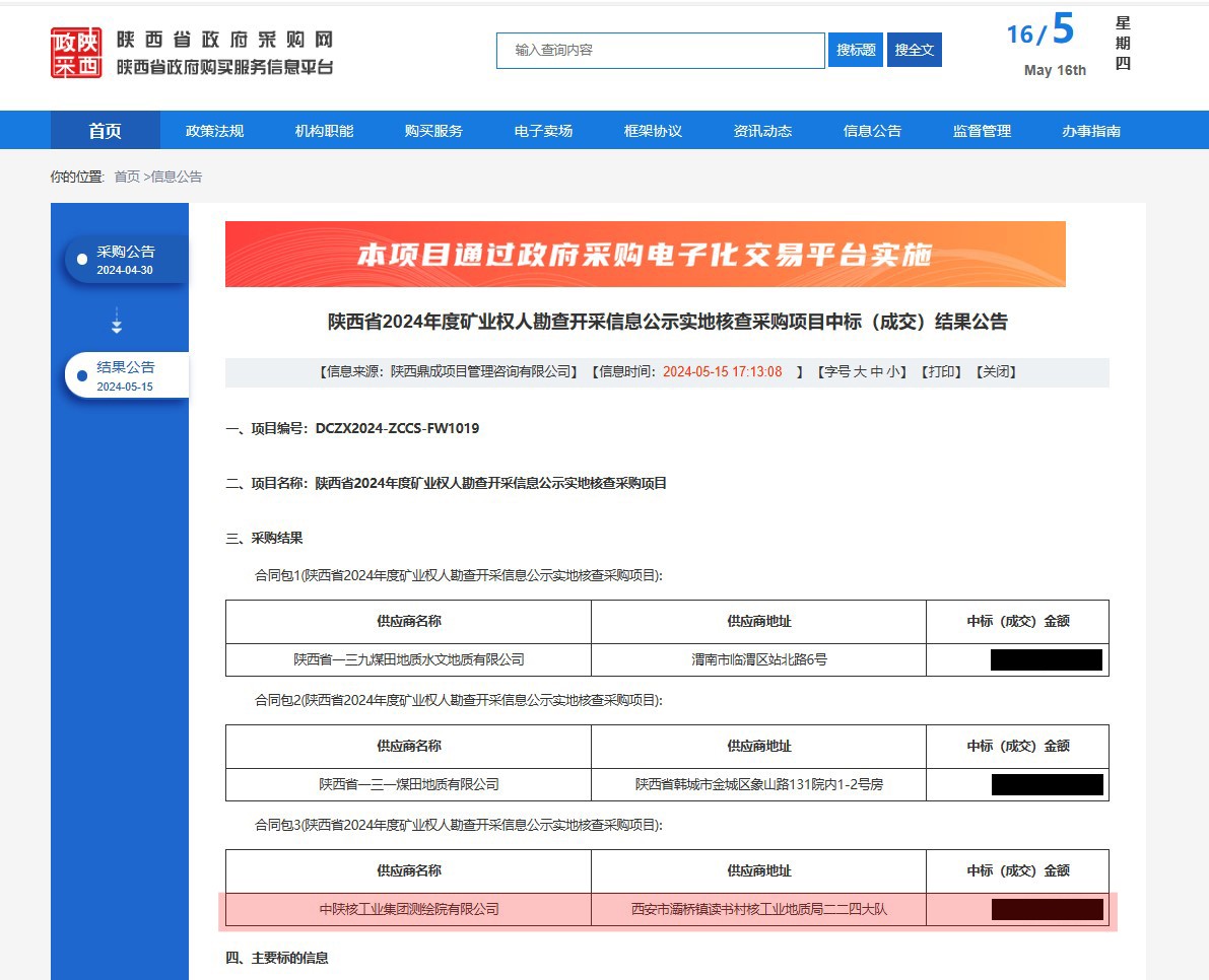 [2024-05-16]中標喜訊!中陜核工業(yè)集團測繪院有限公司成功中標“陜西省2024年...5月15日,在陜西省礦產資源調查評審中心組織實施的“陜西省2024年度礦業(yè)權人勘查開采信息公示實地核查采購項目”招標活動中,中陜核工業(yè)集團測繪院有限公司成功中標3標段。...