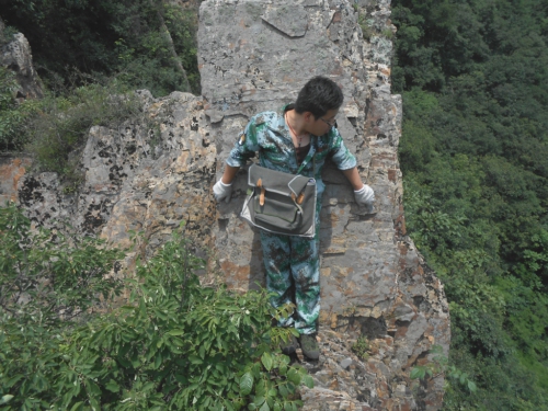 圖上是陳哥和我爬上海拔1294m的山頂后拍攝的,該點(diǎn)點(diǎn)號D2410,是一個(gè)伽瑪異常點(diǎn)。測量時(shí),我們在前一個(gè)點(diǎn)就發(fā)現(xiàn)伽瑪值偏高,而那座山體傾角已超過70度,所處的石英片巖區(qū)域風(fēng)化程度很高,有些地方一腳就可以把巖石踩斷。但陳哥說這里異常值較高,我們需要上到那個(gè)點(diǎn),測量這條異常帶延續(xù)到什么位置,于是我倆提了提褲腰帶,找能踩腳的位置慢慢往上爬。終于,我們登上了山頂,測量和記錄好數(shù)據(jù)后,卻發(fā)現(xiàn)根本無法原路返回,于是就選擇了照片上陳哥腳踩的那個(gè)陡崖,崖壁最窄的位置只夠放兩只腳。還好陳哥的野外工作經(jīng)驗(yàn)豐富,在他的帶領(lǐng)和指導(dǎo)下,我們終于幸運(yùn)的爬到了旁邊的山梁上,從而安全的下了山。雙槽地區(qū)地層陡峭,巖體切割強(qiáng)烈,斷崖峭壁較多,這也只是我們一個(gè)普通小組的真實(shí)寫照。