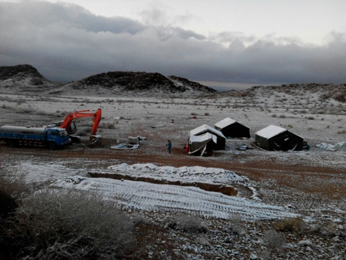 依稀記得3月份剛到這時(shí),漫天飄雪的場(chǎng)景。零下20℃的氣溫,齊膝深的大雪,刺骨的寒風(fēng)打在我們臉上猶如刀割一般疼痛。由于地廣人稀,生活和生產(chǎn)用水都需要到十幾公里以外的白楊河去拉。這種反常的氣候類(lèi)型與生活差異,給剛到這里的我們來(lái)了個(gè)當(dāng)頭棒。盡管外界條件十分艱苦,但大家在這片老一輩地質(zhì)工作者曾經(jīng)揮灑過(guò)無(wú)數(shù)汗水的熱土上,重拾白楊河精神,用堅(jiān)定的信念和頑強(qiáng)的意志克服著一個(gè)又一個(gè)困難。