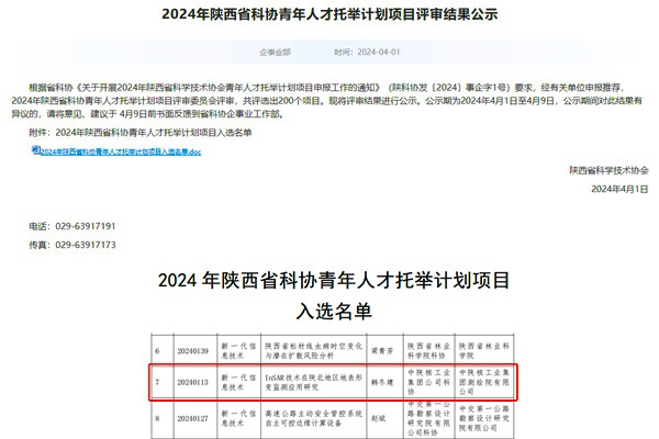 近日,陜西省科學(xué)技術(shù)協(xié)會(huì)公布《2024年陜西省科協(xié)青年人才托舉計(jì)劃項(xiàng)目入選名單》,中陜核工業(yè)集團(tuán)測(cè)繪院有限公司申報(bào)的《InSAR技術(shù)在陜北地區(qū)地表形變監(jiān)測(cè)應(yīng)用研究》成功入選。