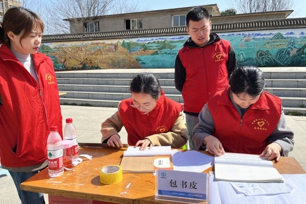 包書皮服務區(qū)和輪胎打氣服務區(qū),志愿者們也早早準備好了各種大小的書皮、剪刀、鋼尺等工具,經過耐心細致的服務,不一會兒,學童們的教育書籍和老人們心愛的小說文選便穿上了干凈的“外衣”,一輛輛自行車、電動車的車胎也打滿了氣駛離現(xiàn)場、繼續(xù)前行。