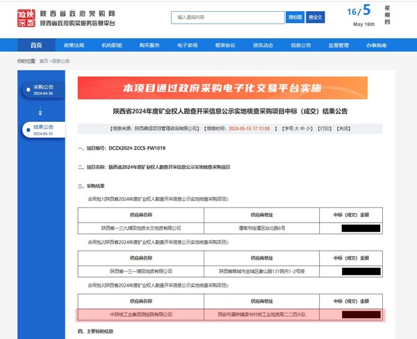 中標(biāo)喜訊!中陜核工業(yè)集團(tuán)測繪院有限公司成功中標(biāo)“陜西省2024年度礦業(yè)權(quán)人勘查開采信息公示實地核查采購項目”3標(biāo)段