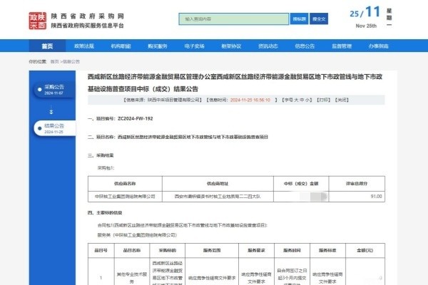 11月25日,從陜西省政府采購(gòu)網(wǎng)獲悉,中陜核工業(yè)集團(tuán)測(cè)繪院有限公司成功中標(biāo)西咸新區(qū)絲路經(jīng)濟(jì)帶能源金融貿(mào)易區(qū)地下市政管線與地下市政基礎(chǔ)設(shè)施普查項(xiàng)目。