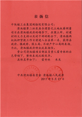 5月27日,中陜核測繪院貴州省金沙縣清池鎮(zhèn)第二批農房辦理登記土地權籍測量項目獲通報表彰。