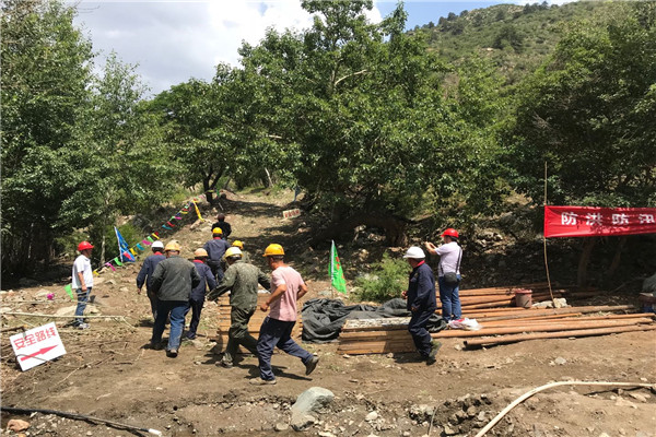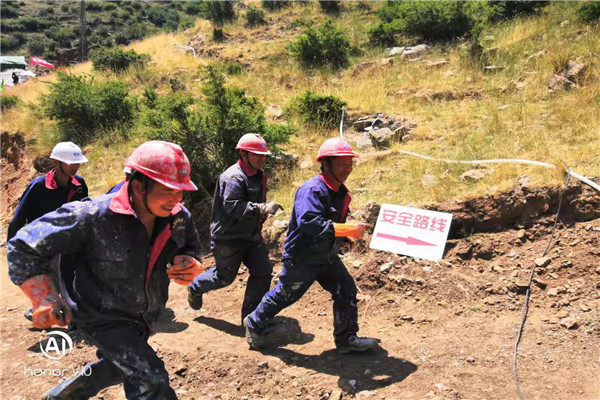 此次演練模擬鉆探項目鉆機現(xiàn)場突遇大雨,河水暴漲,危及人員生命安全和財產(chǎn)安全為背景。在鉆機施工現(xiàn)場,成立了指揮部,指定了安全撤離路線和安全區(qū)域。上午9點55分,預警組發(fā)出河水暴漲警示,總指揮張少平發(fā)出“立即撤離”命令后,鉆機班組立即停機,全體人員嚴格按照預案指定安全路線迅速有序撤離,到達安全區(qū)域后,保衛(wèi)組劉廣建立即清點人數(shù),全體人員順利抵達安全區(qū)域。整個撤離過程僅用了1分15秒,達到了預期效果。