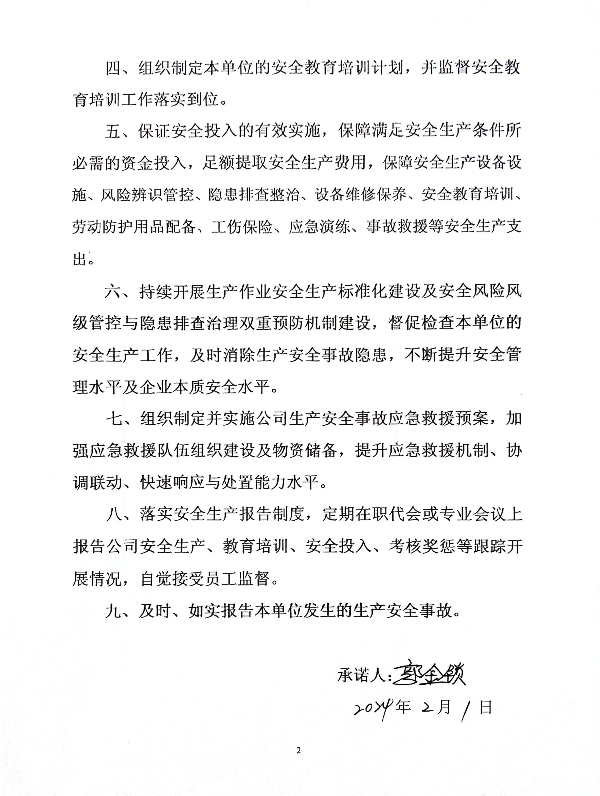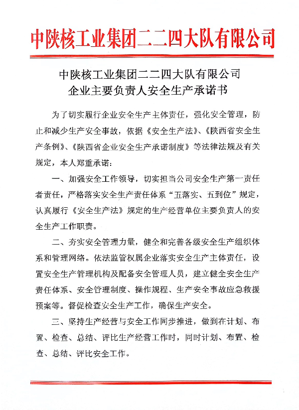 中陜核工業(yè)集團(tuán)二二四大隊(duì)有限公司企業(yè)主要負(fù)責(zé)人安全生產(chǎn)承諾書