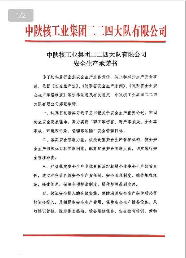 中陜核工業(yè)集團二二四大隊有限公司安全生產承諾書