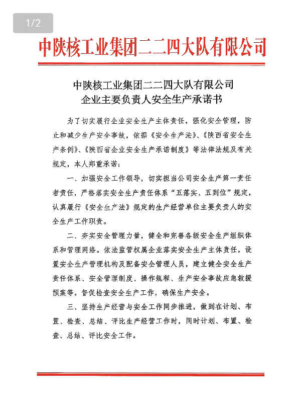 中陜核工業(yè)集團(tuán)二二四大隊(duì)有限公司企業(yè)主要負(fù)責(zé)人安全生產(chǎn)承諾書